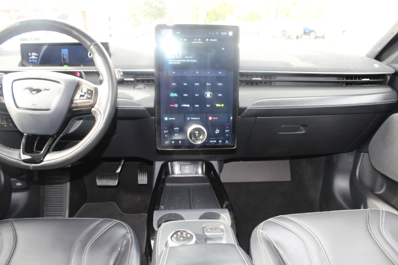With a futuristic design featuring a fixed glass sunroof, high gloss black wheels, and striking black accents, this Mustang Mach-E is sure to turn heads wherever you go. The interior is just as impressive, with a spacious cabin adorned in luxurious ActiveX leatherette seats and a heated leatherette steering wheel for that extra touch of comfort.