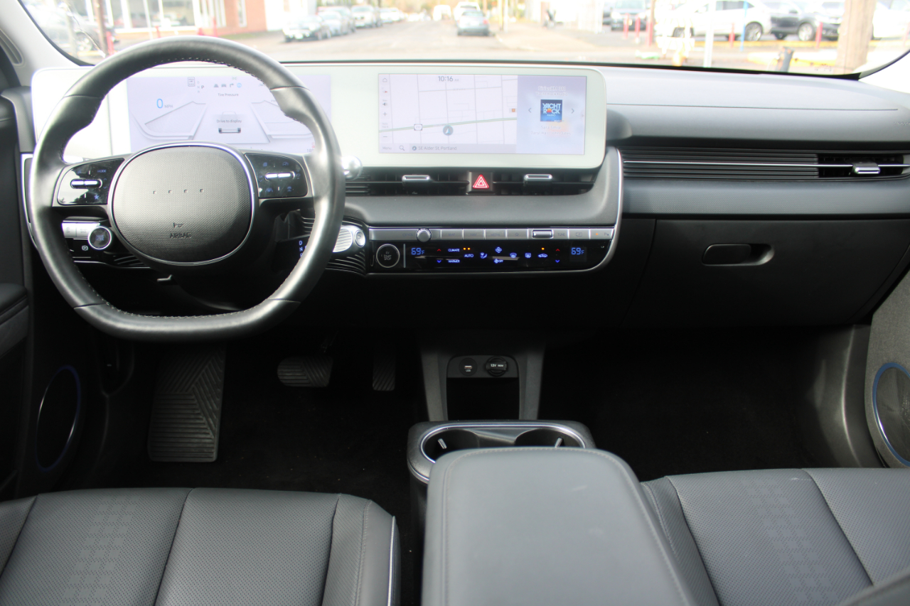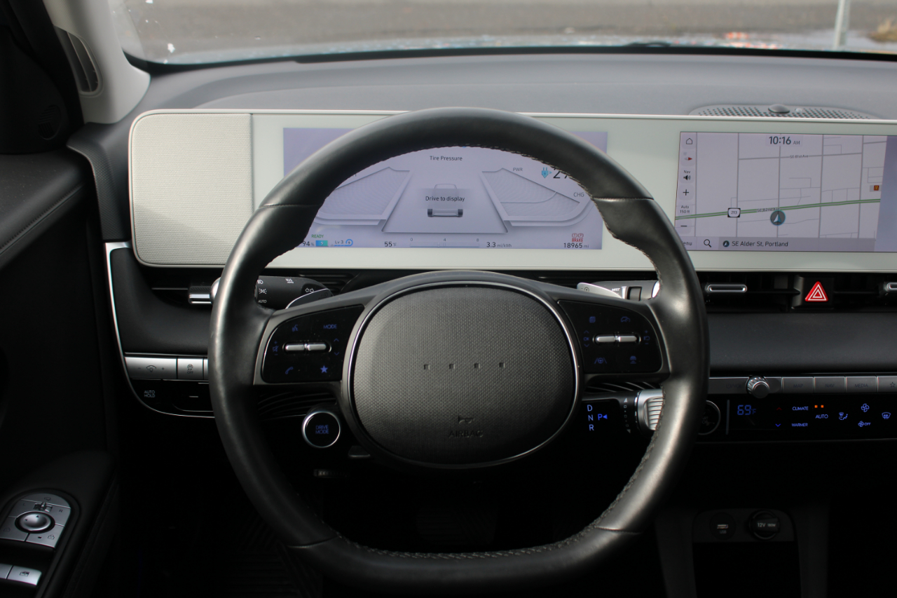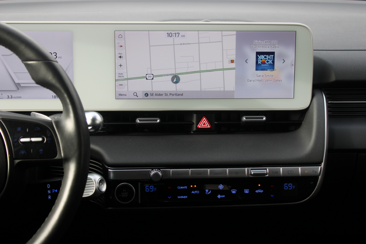 Quiet, smooth, and quick when moving away from a standstill, driving a 2023 Ioniq 5 EV soon becomes second nature. Any learning curve for those coming straight from a conventional gasoline-powered car is short and shallow.It feels stable and composed, a benefit of the low center of gravity made possible by the floor-mounted battery pack. So the Ioniq 5 moves sweetly between left and right turns.Naturally, the versions with all-wheel drive — and therefore the most muscle (320 horsepower and 446 lb-ft of torque) accompanied by the best grip and traction — provide the greatest entertainment, as well as confidence when the time comes to overtake.With brake energy regeneration set to its highest level, the Ioniq 5 can come to a complete stop just by keeping the right foot off the accelerator. This is one-pedal driving, a neat trick exclusive to electric vehicles, and not so tiring in city traffic compared with the usual dance between the throttle and brakes.